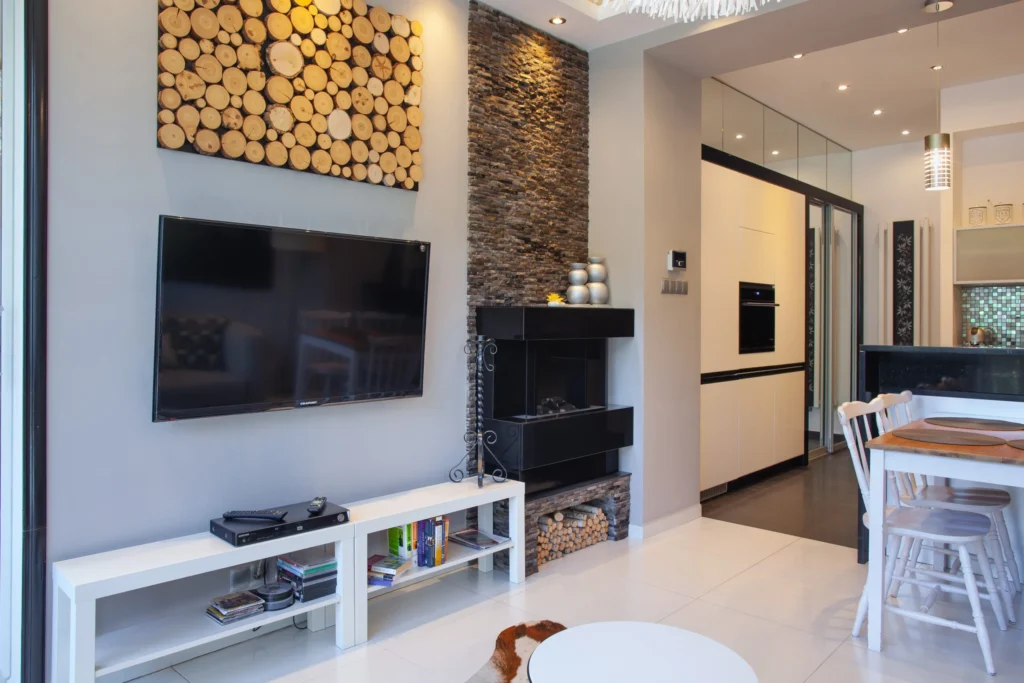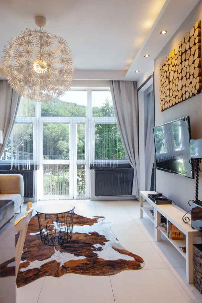 Przestronnego salonu z wyjściem na jeden z dwóch balkonów