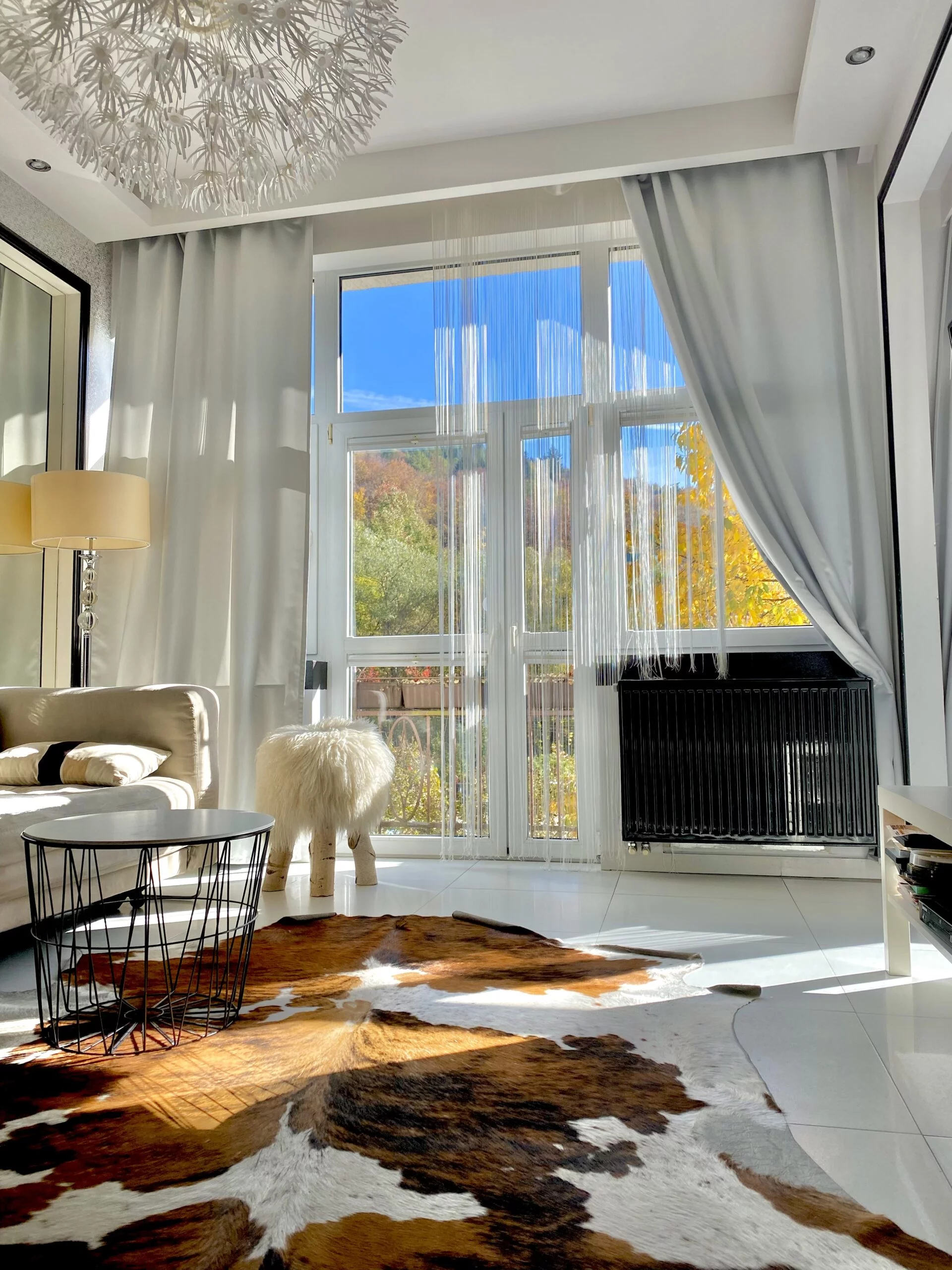 Przestronnego salonu z wyjściem na jeden z dwóch balkonów